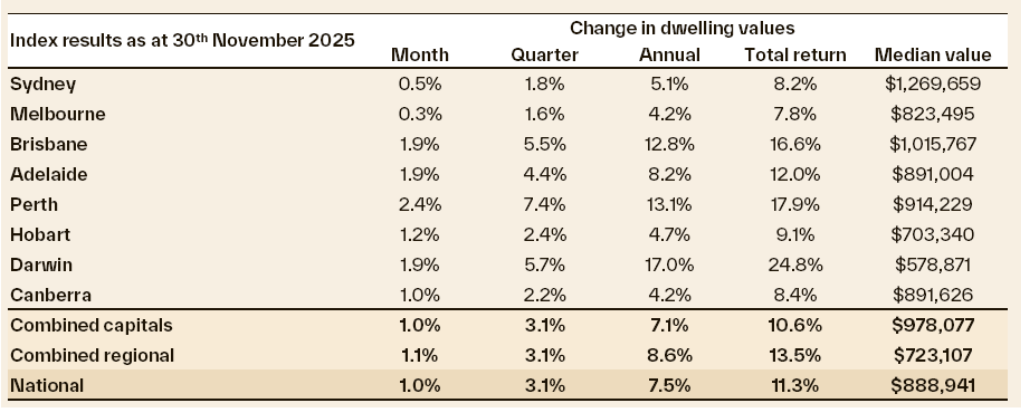 Australia’s housing market posted another month of solid momentum, with Cotality’s national Home Value Index rising 1.0% in November. This marks the third consecutive month where home values have climbed by one per cent or more. Although the pace has eased slightly from October’s 1.1% rise, the overall trend remains positive, signalling resilient buyer demand in the face of broader economic uncertainty.