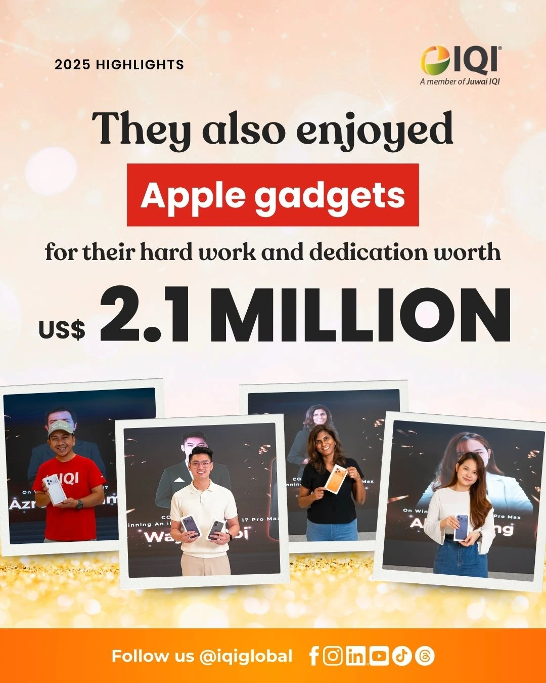 As part of agent recognition initiatives, IQI rewarded its IQI Warriors with Home Bonus Incentives and Apple gadgets valued at RM 2.1 million, covering 463 devices.