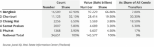 曼谷和附近的春武里府占了外国买家交易的最大份额,仅在这两个地方就有80%的外国买家公寓交易。尽管外国买家很集中,但这里的住房市场很大且多样化,外国买家的交易占市场的份额相对较小。在曼谷尤其如此,外国买家只占所有公寓购房交易的7.8%。